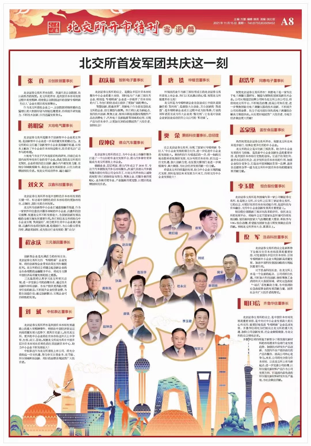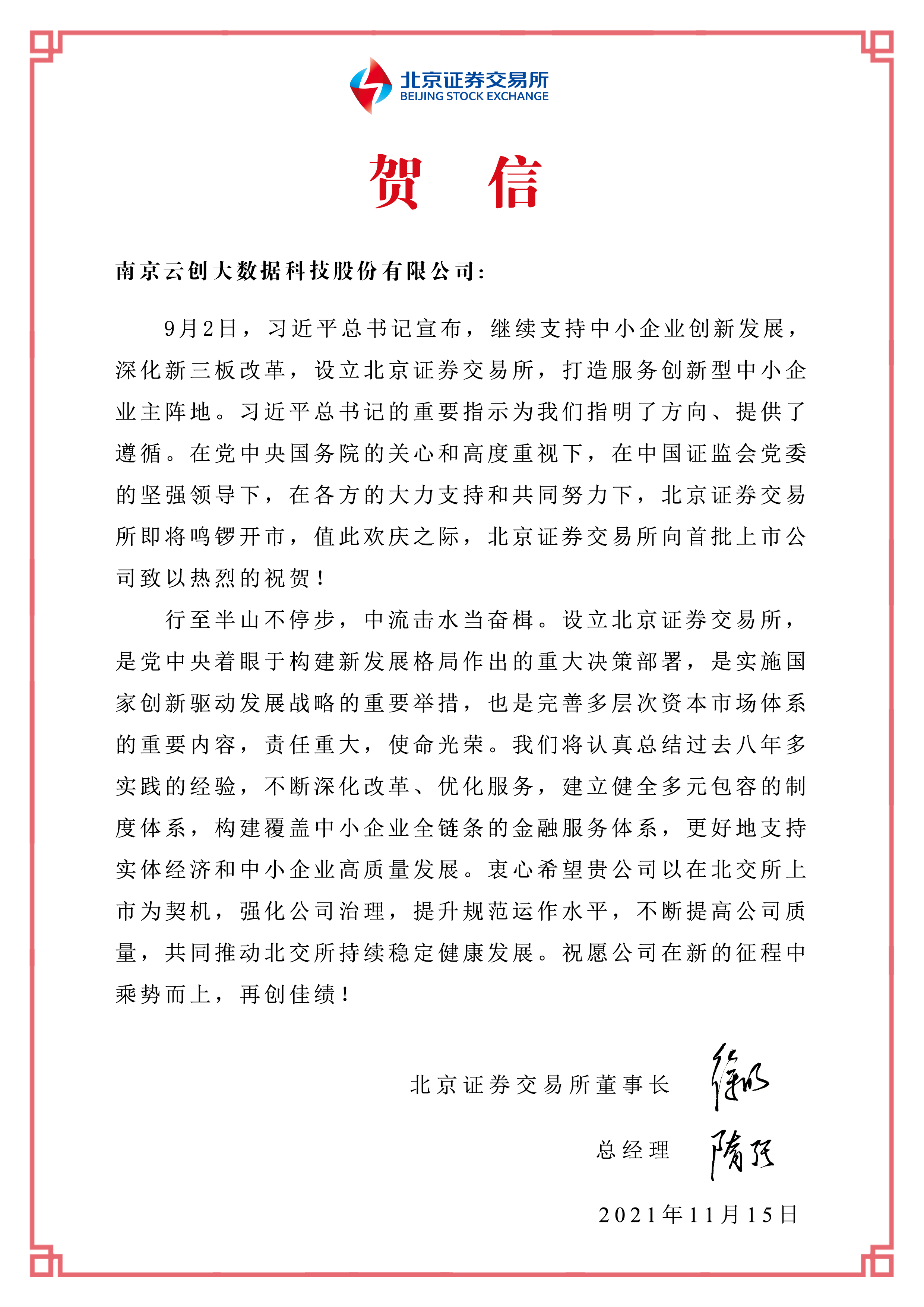 北交所董事長、總經理發來賀信