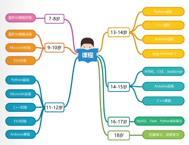 上述幾個年齡階段主要是針對孩子的思維邏輯能力和綜合應用能力來進行劃分的。家長們可以根據(jù)孩子編程學習的實際情況和具體年齡,對照下圖,查找到適合自家孩子的編程課程。