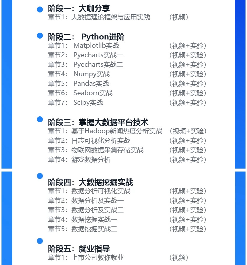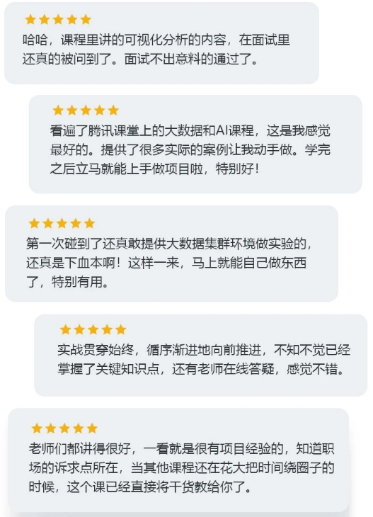 本課程緊扣大數據主流技術,可以實現學校知識的飛躍與工作要求的銜接。同時,課程配套的云創大數據實驗平臺還提供真實項目開發環境,配備大量企業真實項目案例,并提供實驗數據、實驗指導、教學視頻等。僅需14天,即可有效提升大數據實戰技能,幫你贏在就業的起跑線上!