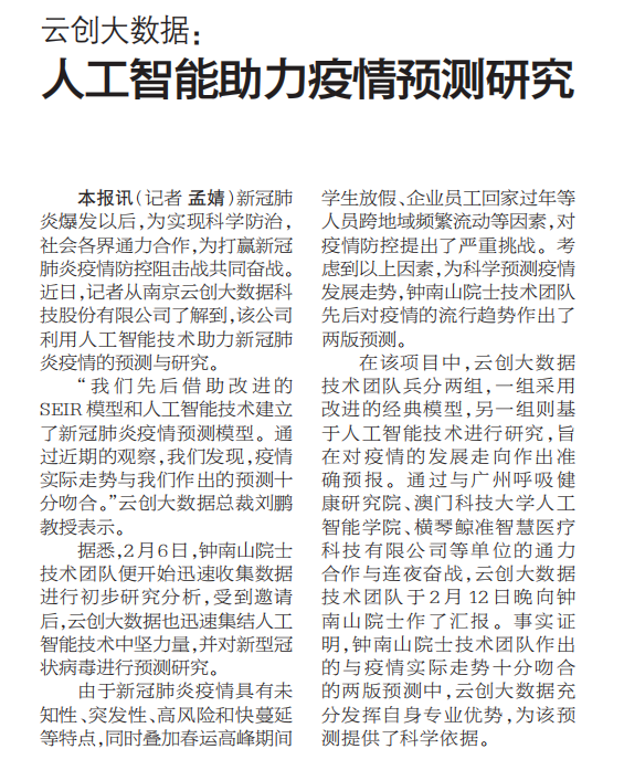 3月25日,《江蘇科技報》A5要聞版《云創大數據:人工智能助力疫情預測研究》,對云創大數據參與鐘南山技術團隊,與多家醫科院校、醫療企業開展合作,對新冠肺炎疫情走勢進行科學預測進行了報道,并對預測方法、合作細節,以及研究成果等進行了介紹。