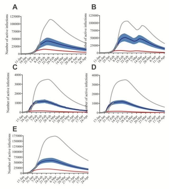 (A)湖北省有嚴格管控,(B)湖北省減少管控力度,(C)廣東省,(D)浙江省和(E)中國在1月23日(藍色),5天后(灰色)和5天前(紅色)采取干預措施時的流行曲線,把每天現存確診病例的實際數據被擬合到曲線(圓圈)上