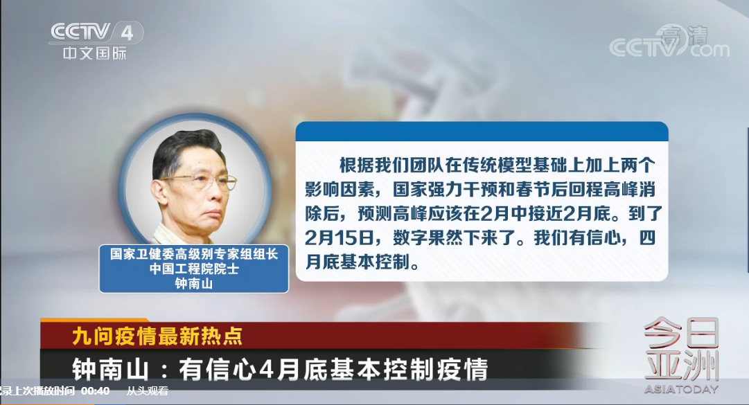2月下旬,鐘南山院士接受央視4套《今日亞洲》欄目采訪透露,“根據我們團隊在傳統模型基礎上加上兩個影響因素,國家強力干預和春節后回程高峰消除后,預測高峰應該在2月中接近2月底。到了2月15日,數字果然下來了。我們有信心,四月底基本控制。”